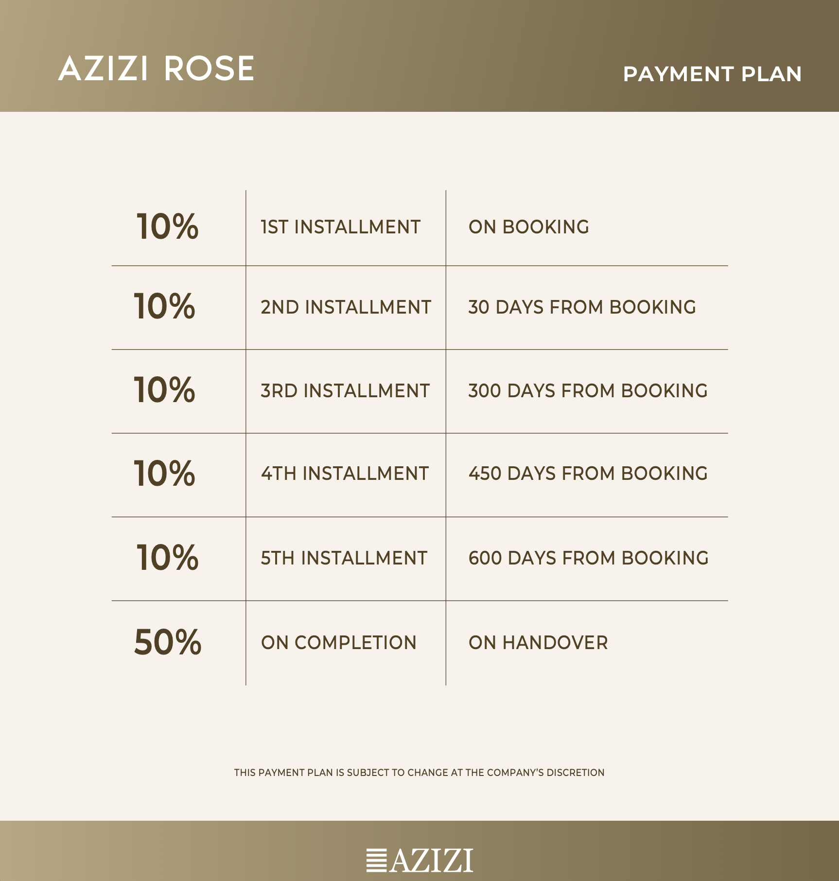 Azizi Rose’s strategic location in Downtown Jebel Ali puts the city’s premier landmarks within grasp. With fast access to Sheikh Zayed Road and the metro, Dubai’s premier beaches, malls and destinations like Palm Jumeirah, Dubai Marina, and Expo City are within easy reach. Ibn Battuta Mall is nearby and with Al Maktoum International Airport only 25 minutes away, the world is your oyster.